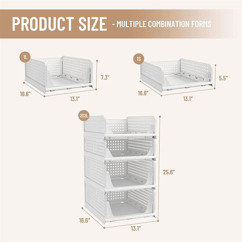 Adjust to your own liking by stacking the perfect number to fit your own space. Set of 4 or 2 wardrobe clothes organizer can be stackable which make home space organized, max the use of vertical space.You can stack multi-layer wardrobe storage organizer according to your needs freely. Dimensions of each when set up: S:16.6" x 13.1" x 5.55" (L x W x H), L:16.6" x 13.1" x 7.32" (L x W x H).