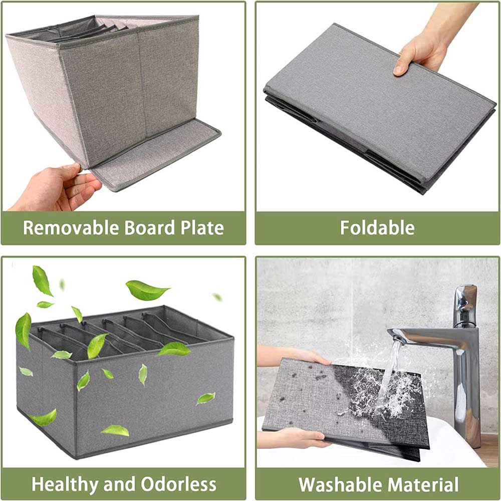 Clothes drawer organizer can meet your daily storage need and can keep your space tidy.Each drawer organizer for clothing has 7 or 9 separate grids, one grid for one item, which can help you pick and take out clothes easier.You also can stack them together to free your closet space.
